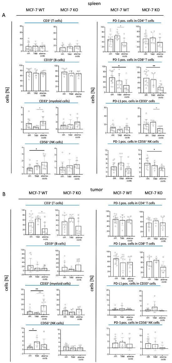 Immune cell distribution in the spleen and tumor of MCF-7-based humanized tumor mice (HTM). Flow cytometric analyses of (A) spleen and (B) tumors of HTM transplanted with MCF-7 WT or KO cells are shown. Each graph represents data from untreated (ctrl.), tamoxifen (TAM)-treated, or abemaciclib-treated mice. Gating was performed as described in Supplementary Figure S4 and the percentage of T (CD3), B (CD19), myeloid (CD33), and NK (CD56) cells of human CD45+ cells are displayed (left column). Percentage of PD-1 or PD-L1 for each population is displayed in the right column. Data are displayed as mean ± SD. Each mouse is represented by a single symbol and significances were calculated using one-way ANOVA and Tukey’s multiple comparisons test. Statistical significances: * p ≤ 0.05, ** p ≤ 0.01.