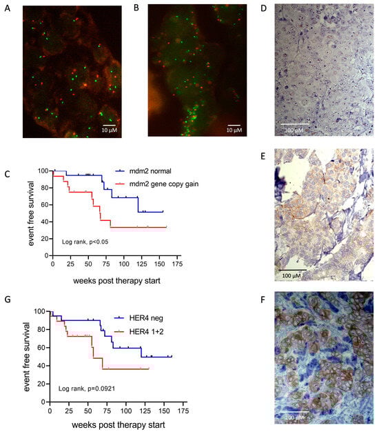 Event-free survival as a function mdm2 gene copy numbers and HER4 expression. Representative FISH images of mdm2 (green dots) and CEN12 (red dots) without (A) and with (B) signal gains are shown. (C) Kaplan–Meier graph illustrating EFS of luminal BC patients treated with abemaciclib as a function of genomic mdm2 and CEN12. Statistical differences were analyzed by Log-rank (Mantel–Cox) test. (D–F) Immunohistochemical HER4 stainings scoring “0” (no expression, “1” (low expression), and “2” (pronounced expression) are exemplified, respectively. (G) Kaplan–Meier graphs illustrating EFS of luminal BC patients treated with abemaciclib as a function of HER4 expression. Log-rank (Mantel–Cox) test.