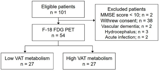 Among the 101 eligible patients who attended our memory clinic for cognitive function assessment, those with a Mini-Mental State Examination (MMSE) score below 10, those who withdrew consent, those diagnosed with cognitive impairment resulting from conditions distinct from AD, and those currently suspected of acute infection or inflammatory states were systematically excluded from the study (Figure 1). This study included a total of 54 subjects (age: 66.4 ± 8.4 years; female, 34 (63.0%)). Among the total cohort, 28 subjects (51.9%) exhibited pathologic changes related to Alzheimer’s. Clinically, 18 were diagnosed as cognitively unimpaired (CU), 14 as having mild cognitive impairment (MCI), and 22 as having dementia. Specifically, among the 18 CU patients, 5 (27.8%) had Alzheimer pathology, as did 7 (50.0%) of the 14 MCI patients and 14 (63.6%) of the 22 dementia patients. The results of the neuropsychological assessment in the total cohort, including cognitively unimpaired, mild cognitive impairment, and dementia subjects, are summarized in Supplementary Table S1. The subjects were categorized into two groups based on VAT metabolism, using a cutoff value of 0.71, which represented the mean maximum standardized uptake value (SUVmax) in the total cohort: 27 in the low- and 27 in the high-VAT-metabolism group. The SUVmax of the VAT in the high-VAT-metabolism group was significantly higher than that in the low-VAT-metabolism group (0.8 ± 0.1 vs. 0.6 ± 0.1, p < 0.001). No significant differences were observed between the low- and high-VAT-metabolism groups in terms of sex; body mass index (BMI, kg/m2); years of education; prevalence of diabetes, hypertension, cardiovascular disease, and hyperlipidemia; or white matter hyperintensity (WMH) volume (Table 1). Cognitive function, evaluated using the Seoul Neuropsychological Screening Battery II (SNSB II), was significantly associated with age, education level, and WMH volume but not with sex, BMI, diabetes, hypertension, cardiovascular disease, or hyperlipidemia. All of the neuropsychological assessment scores except RCFT copy and COWAT were significantly associated with AD-signature region SUVR (Supplementary Table S2).