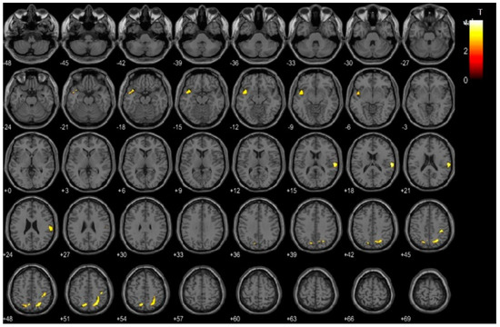 Voxel-based comparison of cerebral glucose metabolism between the high- and low-visceral adipose tissue (VAT)-metabolism groups. The statistical parameter mapping t-maps were su-perimposed on the volume-rendered magnetic resonance imaging (MRI) and T1-weighted template in the axial plane for the high-VAT-metabolism group < low-VAT-metabolism group (p < 0.005, uncorrected at voxel level, cluster size > 100 voxels).
