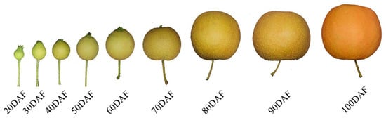 The ‘Xinyu’ pear was certified with newly bred plant variety rights in 2018 and gained the approval of the Fujian Provincial Forest Variety in 2022 (Certificate No. S-SV-PP-017-2022). The fruit peel of a mature “Xinyu” pear is bright yellow-brown, and it was categorized as the brown-peel pear. The ‘Xinyu’ pear trees used in this study were grown in Jianning county, Sanming city, Fujian Province, China, receiving regular agricultural measures and the prevention of pests and diseases. Fruit samples were picked at 20, 30, 40, 50, 60, 70, 80, 90, and 100 days after flowering (DAF) from three trees on a clear day, respectively (Figure 1). Three biological replicates were taken for each fruit sample. All the trees were grown in a square of 4 m × 5 m and received standard horticultural practices such as irrigation, sod cultivation, and pest/disease prevention in a rainproof greenhouse facility. Samples were collected during a sunny noon, peeled with a paring knife (thickness < 1 mm), and sliced into appropriate pieces. In all cases, there were three biological replicates for each sampling date and each biological replicate was mixed from at least five fruits. The peel pieces from different pear fruits were wrapped into one aluminum foil bag and labeled. Then, the samples were frozen in liquid nitrogen and stored at −80 °C until assay.