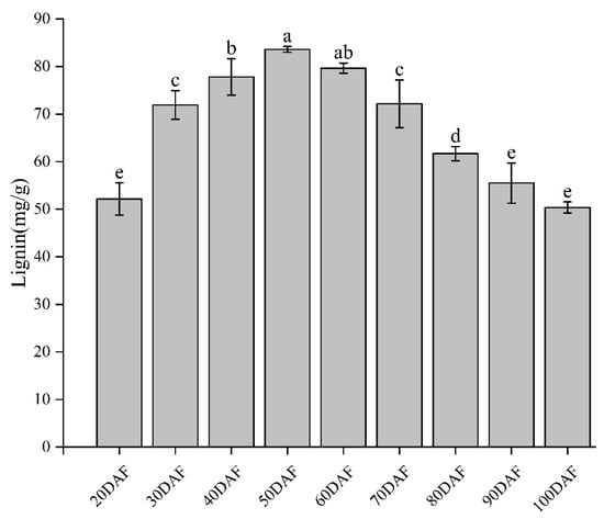Lignin contents in the peel of the ‘Xinyu’ pear at the different development stages of fruit. Bars represent means ± standard deviation (n = 3). Differences among the samples at nine development stages were analyzed by multiple comparisons of a one-way ANOVA (Fisher method) with three biological replicates. The bars sharing the same letter do not have a significant difference from each other, but any two bars with different letters have a significant difference with p < 0.05.