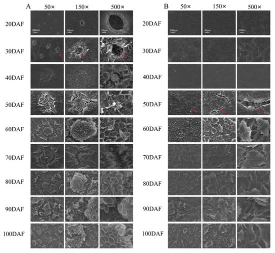 Scanning electron microscopy (SEM) of the peel of the ‘Xinyu’ pear at different stages of fruit development. (A): Fruit pores; (B): fruit surface. (A): The red arrows indicate the period when the fruit spots began to form. (B): The red arrows indicate the period when the fruit surface began to crack. The bars in 20DAF are shared by each single drawing per column.