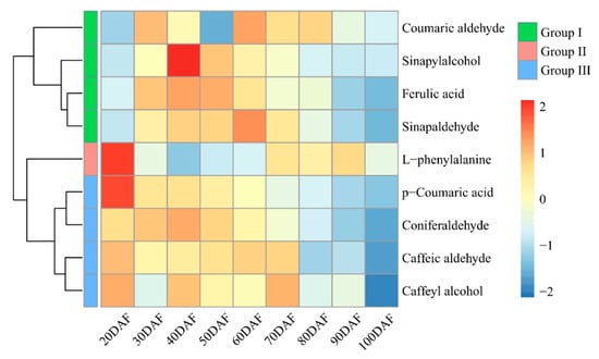 To further confirm the metabolite changes in the peel of the ‘Xinyu’ pear during the peel color change process, a lignin-related metabolomic assay was carried out using UPLC-ESI-MS/MS at nine developmental stages. We detected nine lignin-related metabolites in 27 samples, including L-phenylalanine, p-coumaric acid, counmaic aldehyde, caffeic aldehyde, caffeyl alcohol, ferulic acid, sinapyl alcohol, sinapaldehyde, and conifer aldehyde. The first three highest contents of these identified lignin-related metabolites were L-phenylalanine, p-coumaric acid, and conifer aldehyde, respectively (Table 1). A principal component analysis (PCA) and cluster analysis showed that these metabolites were classified into three groups, named Group I, Group II, and Group III. Group I contained p-coumaric aldehyde, ferulic acid, sinapaldehyde, and sinapyl alcohol, showing a relatively high level of accumulation from 30DAF to 70DAF. Group II contained only L-phenylalanine, which had the highest level at 20DAF, rapidly decreased at 30DAF and 40DAF, and then recovered at 70–90DAF. Group III contained p-coumaric acid, conifer aldehyde, caffeic aldehyde, and caffeyl alcohol, which showed a higher level from 20DAF to 70DAF, and gradually decreased from 80DAF. Except for L-phenylalanine, the other metabolites obviously showed a developmental specificity and had a higher content at the early development stage of pears. However, L-phenylalanine showed the highest level in the peel among these nine metabolites during the development of the ‘Xinyu’ pear (Figure 4).