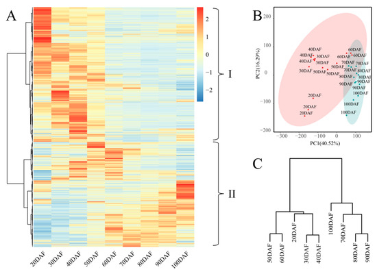 The transcriptome sequencing data at the different stages of fruit development of the ‘Xinyu’ pear. (A): A heatmap of 28,293 expression genes that were divided into two groups at 9 developmental stages of ‘Xinyu’ pear fruit peel. Group I was highly expressed during the early fruit development stages (20DAF–60DAF) and group II was highly expressed during the later fruit development stages (70DAF–100DAF). Different colors indicate the expression levels of DEGs, from blue (low) to red (high); (B): PCA of 28,293 expression genes; and (C): cluster dendrogram of 28,293 expression genes.
