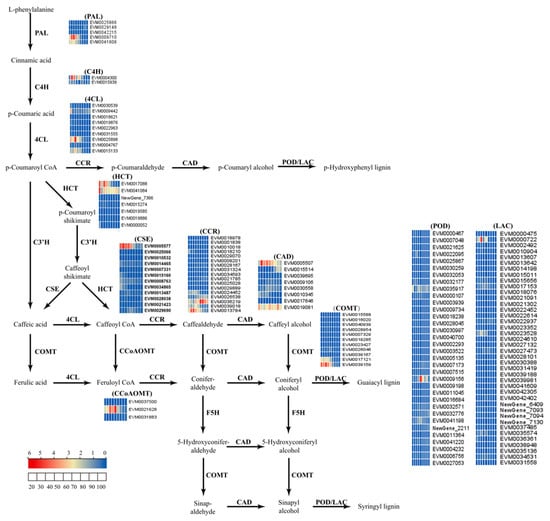 Lignin is one of the main components of plant cell walls and is a phenolic polymer. The biosynthesis of lignin includes the phenylalanine metabolic pathways and lignin-specific pathways []. Many enzymes play a key role in lignin biosynthesis, for instance, phenylalanine ammonia lyase (PAL), cinnamate 4-hydroxylase (C4H), 4-coumarate: CoA ligase (4CL), cinnamoyl-Co A reductase (CCR), caffeoyl-CoA O-methyltransferase (CCoAOMT), ferulate-5-hydroxylase (F5H), caffeic acid O-methyltransferase (COMT), and cinnamyl alcohol dehydrogenase (CAD) as well as peroxidase (POD) and laccase (LAC). These enzymes participate in the biosynthesis of monolipids and the polymerization of monomers to produce lignin polymers [,,,,,,].