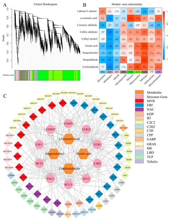 WGCNA of the DEGs identified at the different development stages of the ‘Xinyu’ pear. (A) Hierarchical clustering tree showing nine co-expressed gene modules. A total of 12,304 DEGs are clustered into branches, and each module is represented by the main tree branch. The lower panel displays the module in the specified color. (B) Module–trait correlations and the corresponding p-values are in parentheses. The left panel shows nine modules. The color scale on the right indicates the correlation of module characteristics from −1 (blue) to 1 (red). The panel labeled ‘lignin’ represents the biosynthetic properties of lignin. The other panels represent changes in gene expression levels. (C) The gene network of the hub genes in the green–yellow module, which were positively correlated with the lignin content. The correlation network diagram is divided into four layers, the two outermost genes are transcription factors, the third layer is lignin synthesis genes, and the most central layer is metabolites of lignin.