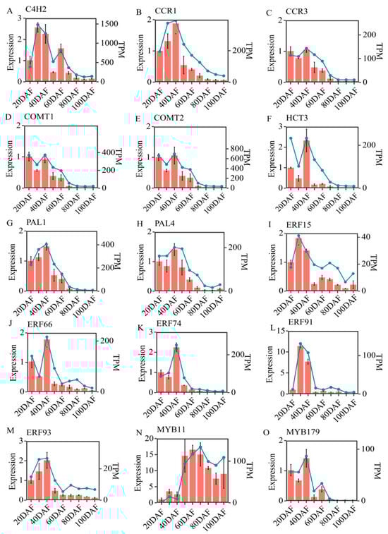 In order to validate the reliability of transcriptomic data and the results of the gene co-expression network analysis, closely related structural genes and transcription factors involved in the phenylalanine metabolic pathway were submitted for RT-qPCR analysis. Our results showed that the expression patterns of eight structural genes and seven transcription factor genes related to the L-phenylalanine metabolic pathway were highly consistent with the dynamics of the corresponding gene obtained by transcriptome analysis (Figure 8). The structural genes, such as C4H2, CCR1, CCR3, COMT1, COMT2, HCT3, PAL1, and PAL4, showed the highest expression levels at 30DAF–40DAF, then their expression levels gradually decreased along with fruit development. The transcription factors, such as ERF74, ERF93, ERF66, and ERF91, had relatively higher expression levels from 20DAF to 40DAF, then rapidly decreased after 40DAF (Figure 8J–M). ERF15 reached its highest expression at 30DAF and then presented a declining expression pattern. MYB11 increased rapidly from 20DAF to 50DAF and reached its highest level at 50DAF–70DAF. MYB179 was only expressed before 70DAF in the fruit development of the ‘Xinyu’ pear, and had an up-down expression pattern, containing two peaks at 40DAF and 60DAF, respectively. The high consistency between the RT-qPCR analysis and transcriptomic data of all these candidate genes further verified that the RNA-Seq results are reliable to identify the DEGs in the ‘Xinyu’ pear during different development stages.