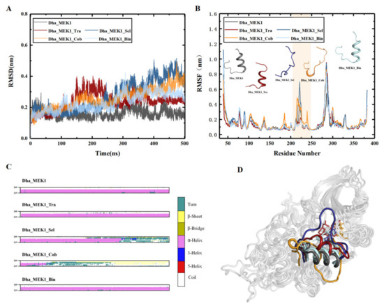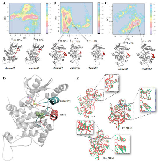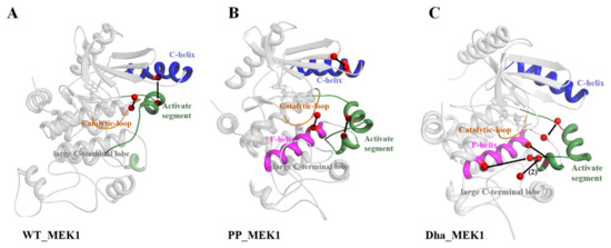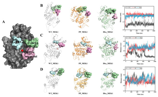 - Liu, Y.; Zhu, J.X.; Guo, X.Q.; Huang, T.C.; Han, J.R.; Gao, J.J.; Xu, D.; Han, W.W. How oncogenic mutations activate human MAP kinase 1 (MEK1): A molecular dynamics simulation study. J. Biomol. Struct. Dyn. 2020, 38, 3942–3958. [Google Scholar] [CrossRef]