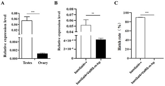 Our previous studies have shown that ocn knockdown leads to complete sterility in male flies, and the expression of ValRS-m is significantly reduced in the ocn RNAi testes. Therefore, to reveal the function of ValRS-m in Drosophila male fertility, we detected the expression level of the ValRS-m gene in the testes and ovaries of 1-day-old adult flies using quantitative RT-PCR. As shown in Figure 1A, the transcript of ValRS-m was considerably higher in the testis than in the ovary. To further examine the role of the ValRS-m in male fertility, the UAS-Gal4 system was adopted to manipulate the expression levels of ValRS-m in the fly testis. It is known that bag-of-marbles (bam) is expressed in spermatogonia as a critical regulator of spermatogonia proliferation and becomes silenced in spermatocytes []. By crossing UAS-ValRS RNAi male flies with bam-gal4 females, ValRS-m was knocked down specifically in the spermatogonia of the male offspring (bamGal4 > ValRS-m-hp). The knockdown efficiency in relation to ValRS-m expression in these testes was validated via qRT-PCR (Figure 1B). To assess whether ValRS-m-knockdown in fly testes may affect male fertility, we crossed the 1-day-old ValRS-m RNAi males with 3-day-old w1118 virgin females and collected the eggs. Surprisingly, in three independent trials, the hatching rates of the eggs in groups crossed with ValRS-m RNAi males were zero. In contrast, 89.57 ± 0.35% of eggs from the crosses with control males hatched (Figure 1C).