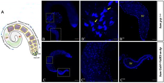 The Drosophila testis is a blunt-ended, coiled tube that supports the production of sperm throughout the life of the fly (Figure 2A). We dissected these adult testes and checked the spermatogenesis progress in these flies. DNA staining can visualize the early-stage nuclei at the apex of the testis and the nuclei of clusters of elongated spermatozoa at the tail of the testis []. We found that testes from ValRS-m-knockdown males exhibited a smaller testicular size compared with the control group (Figure 2B,C). Secondly, we observed that in the control testes, the spermatid nuclei bundles were cone-shaped and the sperm nuclei were concentrated; however, navicular nuclei and spermatid nuclei bundles had disappeared in the ValRS-m-knockdown testes (Figure 2C′). Finally, numerous mature sperm were stored in the seminal vesicles of the control testes (Figure 2B″). In contrast, no mature sperm were found in the seminal vesicles of the ValRS-m RNAi testes (Figure 2C″). Taken together, these results suggest that ValRS-m is essential for sperm production and male fertility.