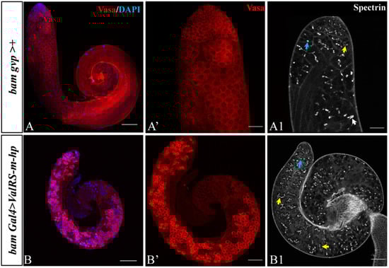 To explore the underlying cause of the male sterility induced by ValRS-m-knockdown in fly testes, the bam gvp >+ and bam Gal4 > ValRS-m-hp fly testes were dissected and stained with Vasa, DAPI, and spectrin to see whether spermatogenesis was disrupted. During Drosophila spermatogenesis, each GSC-derived gonialblast cell first undergoes four rounds of mitotic divisions to generate 16 spermatogonia, which then differentiate into spermatocytes and enter meiosis to produce spermatids. Here, the germ-cell marker Vasa antibody staining showed that the small early-stage germline cells and bigger spermatocytes could be seen in control testes (Figure 3A,A′). However, ValRS-m-knockdown testes accumulated numerous spermatogonia-like cells in most area of the testes (Figure 3B,B′).