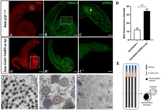 ValRS-m-knockdown caused mitochondrial defects in testes. (A–C): Control testis. (A′–C′): ValRS-m-knockdown testes. The white boxes in (A,A′) indicate mitochondria by MitoTracker staining. Yellow boxes in (B,B′) indicate the mitochondrial envelope morphology (VDAC1 markers). The yellow arrows in (C) indicate ATP signaling (ATP5A markers). (D) The mean mitochondrial staining (Mito) signal (n = 8) detection in testes. (E) Schematic diagram depicting the mitochondrial phenotypes of elongating spermatids in control testes. The dashed arrows indicate the location of cross-sections corresponding to the schematic diagrams. (F–H) Transmission electron microscopy (TEM) images showing mitochondrial morphogenesis. The enlarged view of (F) is shown in (G). In the representative image of control testes (F,G), an axoneme (ax, outlined by a red circle) interacts with a mitochondrial derivative (mt) with paracrystalline material (outlined by a blue circle). A few scattered mitochondrial derivatives exist, but any axonemes are not visible in the ValRS-m RNAi testes (H). ** p < 0.01. Scale bars, 100 μm (A–C,A′–C′); 1 μm (F,H); 200 nm (G).