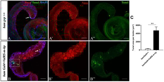 Knockdown of ValRS-m induced apoptosis in the testes. DAPI (blue) stained the nuclei. Vasa (red) stained the germ cells. The single channel images for Vasa staining are shown in (A′,B′); the single channel images for TUNEL staining (green) are shown in (A″,B″); and the merge signal in the testes is shown in (A,B). The white arrow and white box indicate the TUNEL signals in (A,B). (C) The area with TUNEL signals in control and ValRS-m-knockdown testes (n = 10) was measured and quantified. ** p < 0.01. Scale bars: 50 µm.