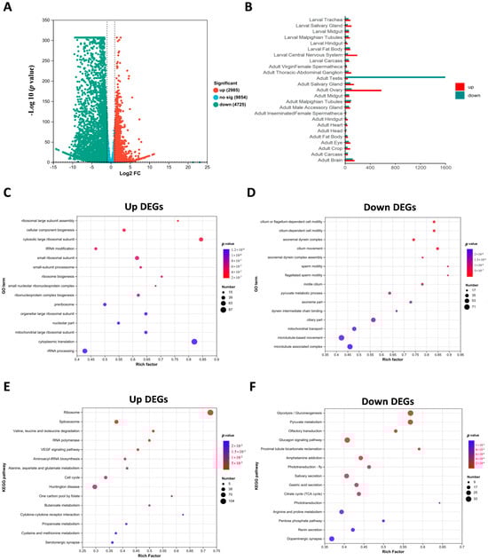Transcript alterations were assessed using RNA-seq in ValRS-m-knockdown testes. (A) Volcano plot of differentially expressed genes (DEGs) from the comparison of the control and ValRS-m-knockdown groups. (B) Tissue expression profile of DEGs in ValRS-m-knockdown testis. (C) GO enrichment analysis of up-DEGs in the testes of Bam Gal4 > ValRS-m-hp relative to the control. (D) GO enrichment analysis of down-DEGs in the testes of Bam Gal4 > ValRS-m-hp relative to the control. (E) KEGG enrichment analysis of up-DEGs in the testes of ValRS-m RNAi relative to the control. (F) KEGG enrichment analysis of down-DEGs in the testes of ValRS-m RNAi relative to the control.