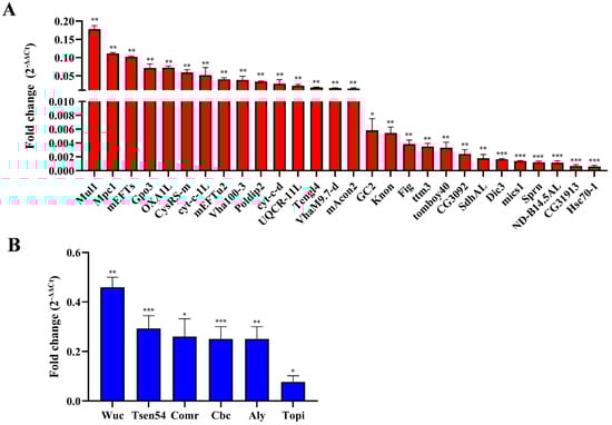 The qRT-PCR validation of DEGs in ValRS-m-knockdown testes. (A) DEGs associated with mitochondria. (B) DEGs related to meiosis. * p < 0.05; ** p < 0.01; *** p < 0.001.