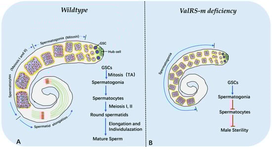 A schematic summary illustrates the phenotypes of wild-type and ValRS-m-knockdown in Drosophila testes. (A) Spermatogenesis in control flies; (B) ValRS-m-knockdown induce male sterility.