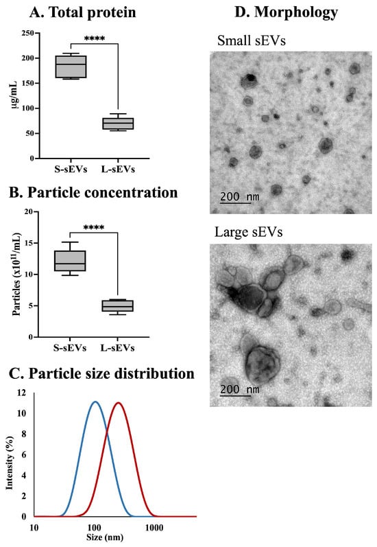 Total protein concentration was higher (p < 0.0001) in the S-sEV samples (mean ± SD: 184.76 ± 21.24 μg/mL) than in the L-sEV samples (70.35 ± 13.22 μg/mL) (Figure 1A). The nanoparticle tracking analysis (NTA) showed that the particle concentration (mean ± SD) was higher (p < 0.0001) in S-sEV samples (12.07 × 1011 ± 1.92 × 1011 particles/mL) than in L-sEV samples (4.89 × 1011 ± 0.95 × 1011 particles/mL) (Figure 1B). It is interesting to note that the number of particles per μg of protein in the S-sEVs samples (6536.45 ± 695.50 particles/μg protein) was similar to that in the L-sEVs samples (7358.61 ± 2687.63 particles/μg protein). The dynamic light scattering (DLS) analysis showed that the particles were smaller (p < 0.01) in the S-sEV samples (119.63 ± 17.46, 78 and 155 nm for the 25th and 75th percentiles) than in the L-sEV samples (282.51 ± 26.61, 160 and 330 nm for the 25th and 75th percentiles) (Figure 1C). The transmission electron microscopy (TEM) images confirmed that the S-sEV samples contained smaller EVs than the L-sEV samples, and further showed that the EVs in the S-sEV samples were mostly spherical in shape, whereas those in the L-sEV samples were more heterogeneous in shape (Figure 1D).