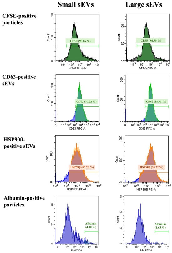 Flow cytometric analysis showed that most of the particles analyzed were EVs, as they were positive for carboxyfluorescein succinimidyl ester (CFSE). The percentages (mean ± SD) were similar for S-sEVs (79.64% ± 3.83%) and L-sEVs (80.89% ± 5.15%). Flow cytometry analysis also revealed high and similar levels of CD63 and HSP90β expression in S-sEV and L-sEV samples (Figure 2). Specifically, the percentages of S-sEVs and L-sEVs expressing CD63 were 79.62% ± 1.10% and 81.85% ± 4.54%, respectively. The percentages of S-sEVs and L-sEVs expressing HSP90β were 80.75% ± 5.98% and 88.06% ± 2.66%, respectively. Finally, flow cytometry analysis showed that samples of S-sEVs and L-sEVs had low albumin content. Specifically, the percentage of albumin-positive particles was 3.84% ± 1.47% in S-sEVs samples and 2.28% ± 0.75% in L-sEVs samples (Figure 2).
