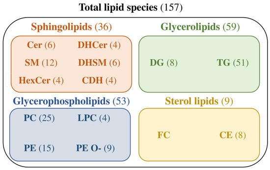 The targeted lipidomic analysis identified and quantified a total of 157 lipid species belonging to four major lipid categories, namely sphingolipids (SP), glycerophospholipids (GP), glycerolipids (GL), and sterol lipids (ST). The identified and quantified lipid species belong to 14 lipid classes, specifically six SP, four GP, two GL and two ST classes (Figure 3).