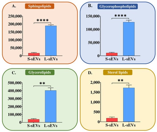 Histograms showing the differences between large (L-) and small (S-) seminal extracellular vesicles (sEVs) in the relative abundance of sphingolipids (A), glycerophospholipids (B), glycerolipids (C), and sterol lipids (D). Data are expressed as pmol eq/mg protein and are the mean ± SD. **** p value < 0.0001, ** p value < 0.01.