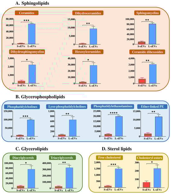 Histograms showing the differences between large (L-) and small (S-) porcine seminal extracellular vesicles (sEVs) in the relative abundance of identified and quantified lipid classes distributed by lipid categories: sphingolipids (A), glycerophospholipids (B), glycerolipids (C), and sterol lipids (D). Data are expressed as pmol eq/mg protein and are the mean ± SD. **** p value < 0.0001, *** p value < 0.001, ** p value < 0.01, * p value < 0.05.