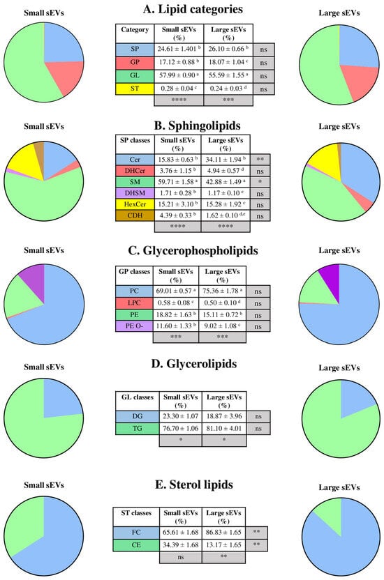 Pie charts and supplementary tables showing the distribution of different categories (A) and classes of lipids (B–E) between small (S-) and large (L-) porcine seminal extracellular vesicles (sEVs). Data in tables show the mean percentage (%) ± SD. **** p value < 0.0001, *** p value < 0.001, ** p value < 0.01, * p value < 0.05, ns p value > 0.05. a, b, c, d, e indicates differences at p < 0.05 between lipid classes within a lipid category. SP: sphingolipids; GP: glycerophospholipids; GL: glycerolipids; ST: sterol lipids; Cer: ceramides; DHCer: dihydroceramides; SM: sphingomyelin; DHSM: dihydrosphingomyelin; HexCer: hexosylceramide; CDH: ceramide dihexoside; PC: phosphatidylcholine; LPC: lyso-phosphatidylcholine; PE: phosphatidylethanolamine; PE O-: ether-linked phosphatidylethanolamine; DG: diacylglycerols; TG: triacylglycerols; FC: free cholesterol; CE: cholesteryl esters.