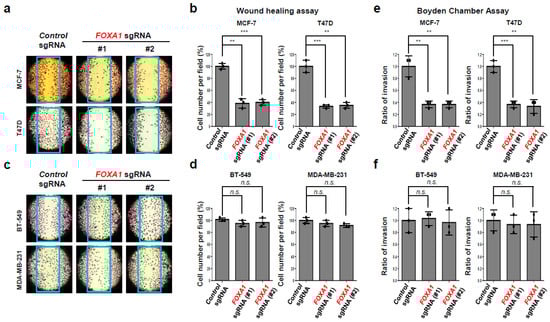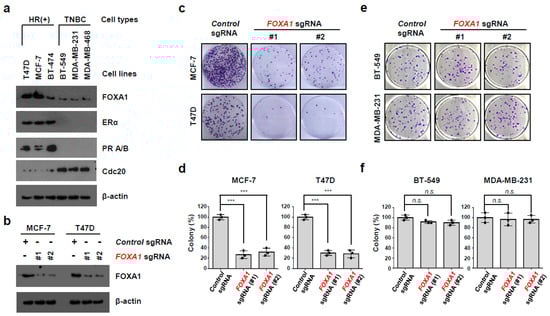 2.4. FOXA1 Is Highly Expressed in Hormone-Receptor-Positive Breast Cancer (HR+ BC) Cell Lines and Controls the HR+ Breast Cancer Cell Proliferation and Metastasis