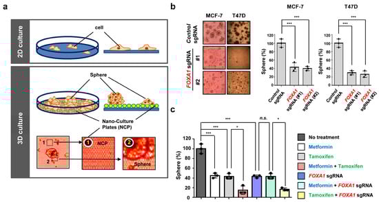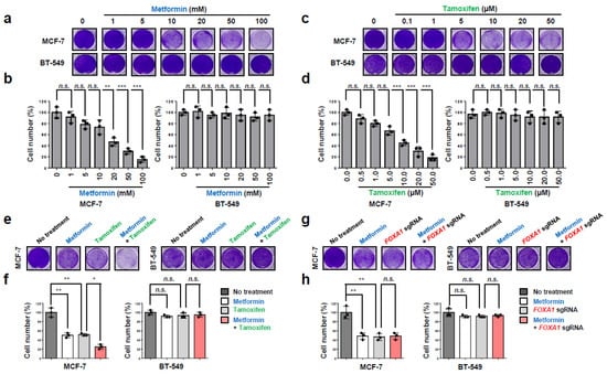 2.5. Metformin and FOXA1 Deletion Enhance Tamoxifen-Mediated Tumor Cell Growth Inhibition in Hormone-Receptor-Positive Breast Cancer (HR+ BC) Cells