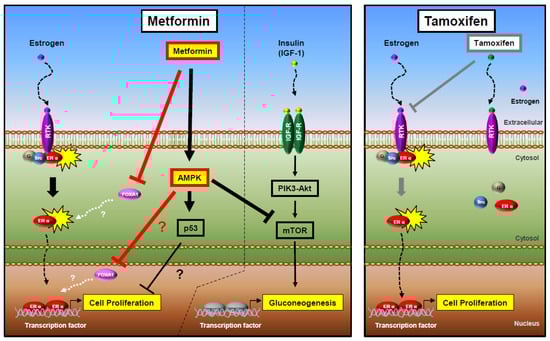 - Goodwin, P.J.; Chen, B.E.; Gelmon, K.A.; Whelan, T.J.; Ennis, M.; Lemieux, J.; Ligibel, J.A.; Hershman, D.L.; Mayer, I.A.; Hobday, T.J.; et al. Effect of Metformin vs Placebo on Invasive Disease-Free Survival in Patients With Breast Cancer: The MA.32 Randomized Clinical Trial. JAMA 2022, 327, 1963–1973. [Google Scholar] [CrossRef] [PubMed]