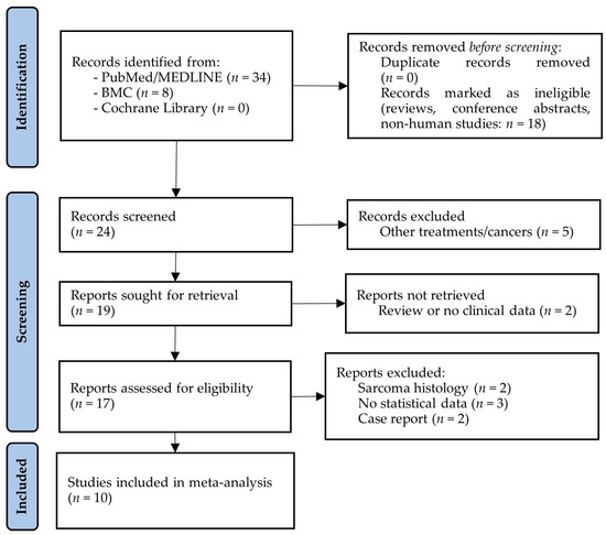 The electronic database searches for studies about the effect of CRS plus HIPEC on the survival of ECPM resulted in a total of 42 articles. No duplicates were identified, and after the removal of animal and cellular reports, reviews, and meeting/conference abstracts, 24 articles remained for title and abstract screening. In total, 7 of the 24 articles were excluded because they either reported results from other tumors or were review articles. Seventeen studies were considered for full-text assessment; however, a further seven of these had to be excluded due to the presence of different study interests (e.g., only hazard ratios from Cox regression models were included), the inclusion of other tumors, or their status as case reports (Figure 1).