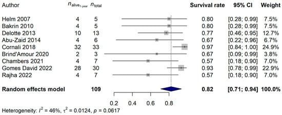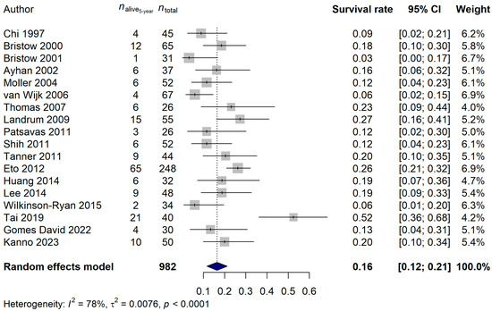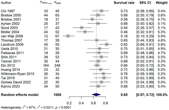 Statistical analyses were performed within the R for Windows version 4.3.3 environment (R Foundation for Statistical Computing, 2022, Vienna, Austria) using the R package meta (version 7.0-0) [18]. Survival rates were used for the effect size measurement, and random-effects models were performed. The heterogeneity variance measure (τ2) was estimated using the restricted maximum likelihood and Q profile method [19,20]. Between-study heterogeneity and publication bias were tested with Higgins and Thompson’s I2 statistic [21] and Egger’s regression test [22], respectively. Group comparisons were performed using the Mantel–Haenszel method [19,23,24]. Forest plots were used to graphically represent study results.