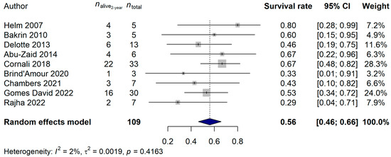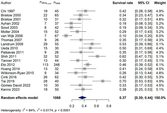 Since both the surgical and oncological methods evolved significantly in the last 2–3 decades, it was also investigated whether the survival rates found in the studies conducted before or after the year 2010 differ. For the 1-year survival rates, a marginal difference was found [before 2010: 57.44% (95% CI: 44.00–70.88%); after 2010: 69.78% (95% CI: 66.07–73.48%); p = 0.0830; Figure S3]. The 2-year survival rates differed significantly [before 2010: 29.64% (95% CI: 20.72–38.56%); after 2010: 43.15% (95% CI: 35.27–51.03%); p = 0.0261; Figure S4], while no significant difference could be found in the 5-year survival rates [before 2010: 12.88% (95% CI: 7.16–18.59%); after 2010: 19.24% (95% CI: 12.12–26.36%); p = 0.1718; Figure S5].