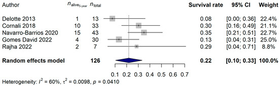 The 2-year and 5-year survival rates were also investigated. A total of 109 and 126 patients, and 48 (44.04%) and 94 (74.60%) deaths, were observed for the 2-year and 5-year data, respectively. A 56.07% (95% CI: 46.38–65.76%) 2-year survival rate and a 21.88% (95% CI: 10.40–33.35%) 5-year survival rate was estimated (Figure 3 and Figure 4). Neither the heterogeneity of the studies (2-year analysis: p = 0.3815; 5-year analysis: p = 0.6045) nor the investigated clinical parameters had an effect on the results of the analysis.