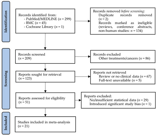 The literature search for CRS-only articles resulted in a total of 345 articles. After the removal of duplicates, animal and cellular studies, reviews, and meeting/conference abstracts, 209 articles remained for the title and abstract screening. A total of 158 articles were excluded due to their reporting about non-ECPM tumors, being a review or non-clinical publication, or because the full text was not available. The full texts were assessed for a total of 51 papers, from which an additional 29 had to be removed because they did not include sufficient statistical data to be included in the meta-analysis. Moreover, an additional paper [33] had to be excluded as it introduced a significant amount of publication bias due to its high number of cases (over 10,000), compared to the lower scale of the remaining studies. In total, 21 studies were included in the following analyses (Figure 5).