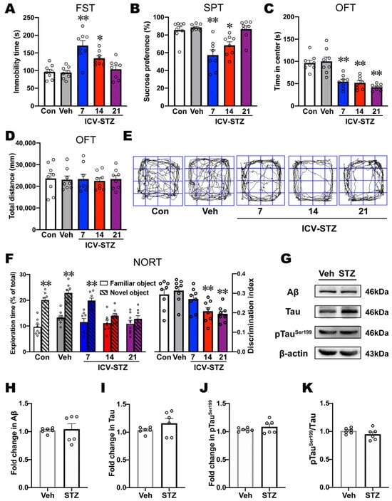 2.1. ICV-STZ Induced Depression- and Anxiety-like Behaviors before Cognitive Impairment