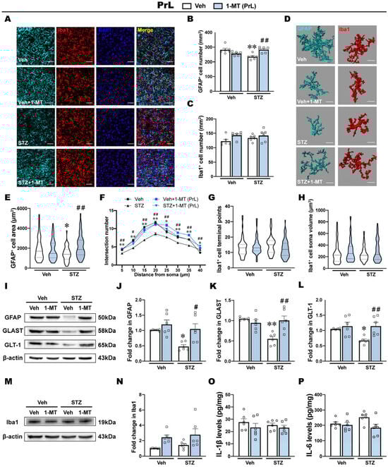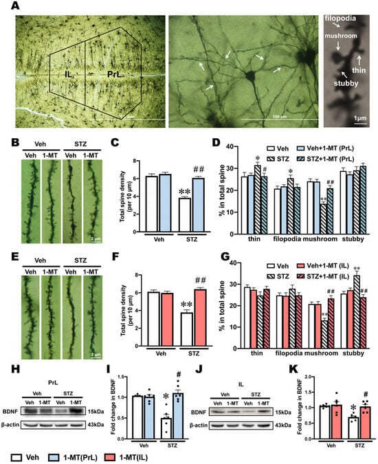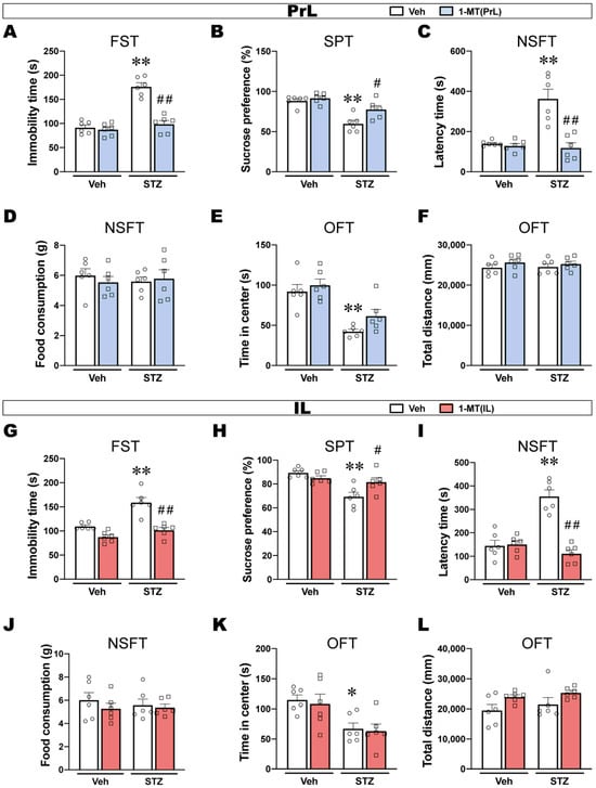 2.3. Intra-PrL or -IL Injection of 1-MT Blocks ICV-STZ-Induced Depression-like Behaviors