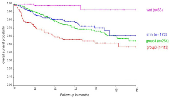 Figure 1. Kaplan–Meier curves for the four consensus MB subgroups in the Cavalli et al. (2017) dataset up to 144 months (χ2 = 31.68, p = 6.12 × 10−7). Sample sizes by MB subgroup: Group 3 (red) n = 113; Group 4 (green) n = 264; SHH (blue) n = 172; WNT (purple) n = 63.
