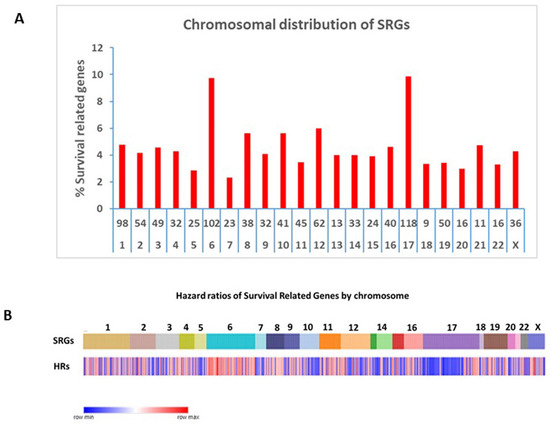 Figure 2. Chromosomal distribution of SRGs. (A) Distribution of the proportions of the number of SRGs to the total number of genes on each chromosome. For the x-axis legends, the top row shows the number of the SRGs, and the bottom row shows the chromosome number. The number of SRG genes for each chromosome was divided by the total number of protein-coding genes for each chromosome and expressed as a percentage in the y-axis legend. The highest proportions of the SRGs were noted on chromosomes 6 and 17 (both p-values < 0.0001), compared to the SRG proportions for the other chromosomes. (B) Chromosomal distribution of hazard ratios of SRGs. For chromosome 6, most of the hazard ratios for SRGs were >1 (red, i.e., high gene expression → poor survival). For chromosome 17, most of the hazard ratios for the p-arm SRGs were <1 (blue; i.e., high gene expression → better survival), while most of the hazard ratios for the q-arm SRGs were >1 (red; i.e., high gene expression → poor survival).