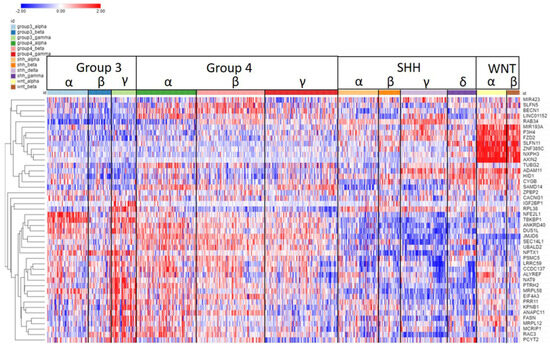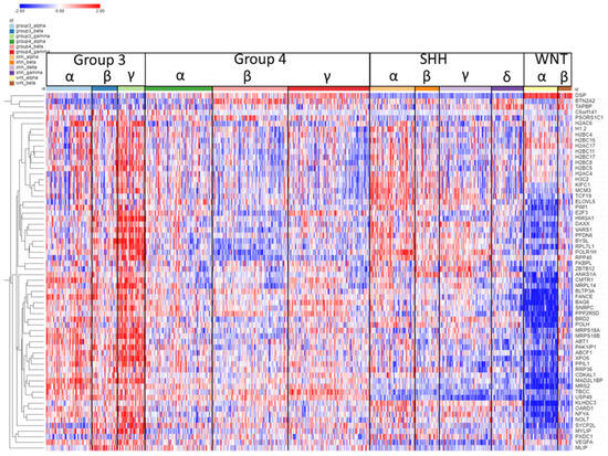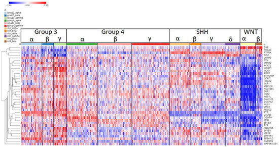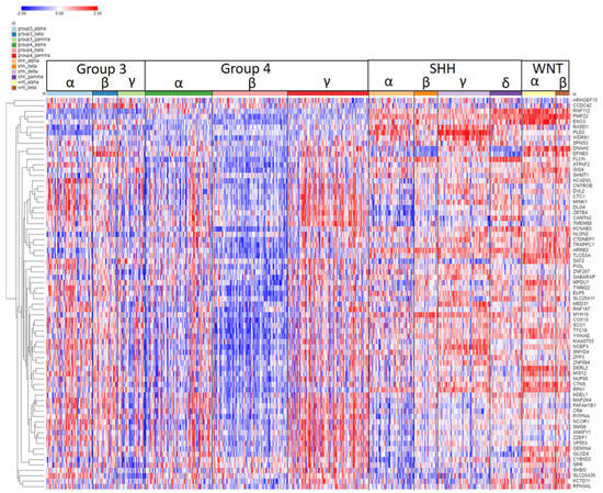 Figure 9. Heatmap and cluster analysis of the SRGs on chromosome 17p. Each column is an individual, each row is an SRG, and the color shows the low (blue) to high (red) gene expression levels. The individuals were grouped by the MB molecular subtypes and subgroups. Group 4β shows a relatively decreased expression of SRGs. Genes were ordered by cluster analysis of expression.