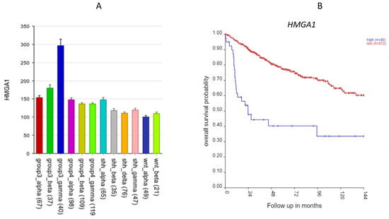 Figure 5. The HMGA1 gene. (A) HMGA1 expression by subtype. It was most elevated in the Group 3 gamma subtype (p < 0.0001). (B) Kaplan–Meier curves for the high (blue) vs. low (red) expression groups for HMGA1 up to 144 months using the Cavalli dataset (p = 2.46 × 10−11, high n = 40, low n = 572).