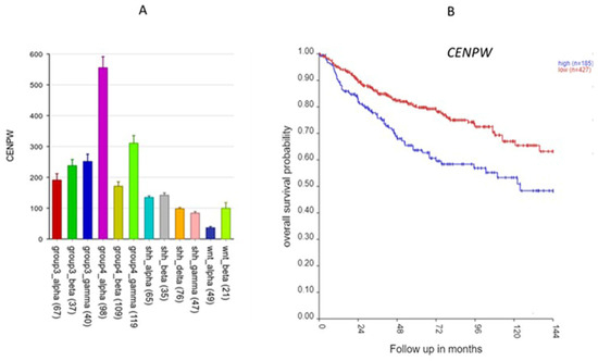 Figure 7. The CENPW gene. (A) Gene expression of CENPW by MB subtypes (p < 0.0001); (B) Kaplan–Meier curves (p = 2.25 × 10−4).