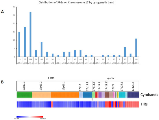 Figure 10. (A) The distribution of the SRGs on the p and q arms of chromosome 17 by cytogenetic band. The x-axis legend indicates the cytogenetic band and the total number of genes on each cytogenetic band. (B) Distribution of the SRG hazard ratios on chromosome 17 by cytogenetic band. Blue bars indicate HR < 1 for an SRG, while red bars indicate HR > 1. The p arm has more SRGs than the q arm. High hazard ratios are noted for SRGs at the telomere end of 17q.