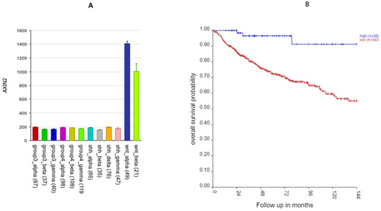 Figure 12. AXIN2 on 17q. (A) AXIN2 gene expression by MB subtype: higher expression in the WNT subgroup (F = 577.14, p < 1.0 × 10−300). (B) Kaplan–Meier curves: elevated expression of AXIN2 is associated with better survival (p = 1.05 × 10−4).