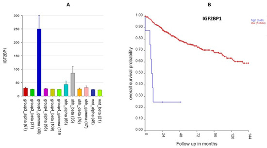 Figure 13. IGF2BP1 on 17q. (A) IGF2BP1 gene expression by MB subtype: higher expression in Group 3γ (F = 23.59, p = 6.81 × 10−42); (B) Kaplan–Meier survival curves: reduced expression of IGF2BP1 is associated with better survival (p = 8.9 × 10−12).