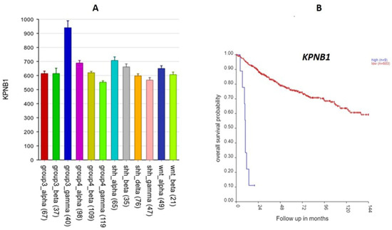 Another 17q SRG associated with significant GO terms (Table 2) was KPNB1 (Karyopherin). Its high expression was associated with worse survival (Figure 14) (HR = 1.40, p = 2.92 × 10−5). KPNB1 expression was also specifically over-expressed in Group 3γ (Figure 14) in the Cavalli dataset and in Group 3 in the Swartling dataset. The KPNB1 protein is involved in the nuclear import of proteins and also plays a role in mitosis [17,18].