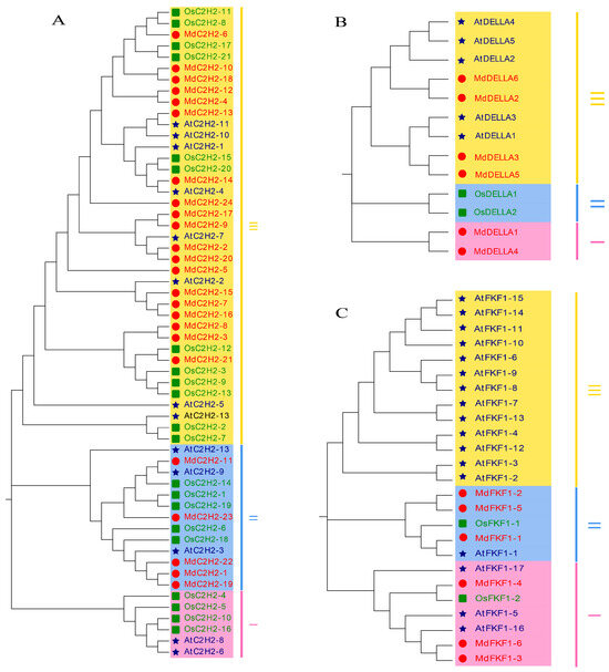 Phylogenetic relationships of three gene families in Arabidopsis (blue star), rice (green square), and apple (red circle) (A) C2H2; (B) DELLA; (C) FKF1. The position of I, II, and III lines indicates that the families are divided into three subgroups.
