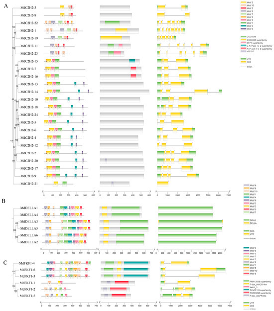 Gene structure and conserved motif analysis of three gene families in the apple genome: (A) C2H2; (B) DELLA; (C) FKF1.