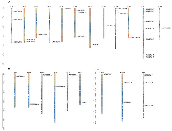 Chromosomal localization analysis showed that the 24 apple MdC2H2 family members were distributed on twelve chromosomes (Figure 3A). Chr01, Chr05, Chr09, Chr10, and Chr16 did not have MdC2H2 genes. The MdC2H2 genes were distributed on the remaining chromosomes, and six chromosomes had one MdC2H2 gene. The six apple MdDEDLLA family members were distributed on six chromosomes (Figure 3B). Among them, the MdDEDLLA genes were distributed on all six chromosomes with one on each chromosome. The six apple MdFKF1 family members were distributed on three chromosomes (Figure 3C), of which MdFKF1-1 was located on the upper end of Chr03, MdFKF1-2 and MdFKF1-3 were located in the middle of Chr13, and MdFKF1-4~MdFKF1-6 were located on Chr16, where MdFKF1-4 was located on the upper end of the chromosome and MdFKF1-5 and MdFKF1-6 were located on the lower end of the chromosome.
