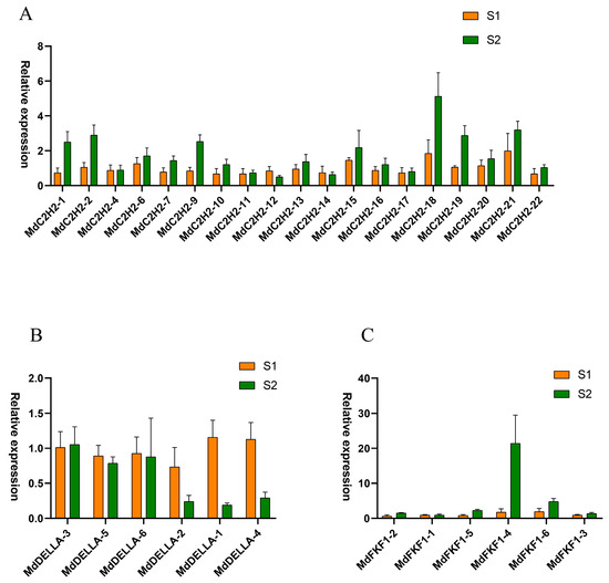 To further investigate the role of the apple C2H2, DELLA, and FKF1 families in plant flowering, 19 C2H2 genes, 6 DELLA genes, and 6 FKF1 genes were selected from the dormant (S1) and expanding (S2) phases of flower buds and were analyzed using qRT-PCR. The fluorescence quantification results showed that the expression of genes in the MdC2H2 ZFP family was not high in the S1 period (Figure 5A), and only the expression of MdC2H2-1, MdC2H2-2, MdC2H2-9, and MdC2H2-18 differed significantly from that in the S1 period in the S2 period (twice as much as that in the S1 period). The expression of the other genes did not differ significantly from that in the S1 period. In the MdDELLA family (Figure 5B), the expression of MdDELLA1, MdDELLA2, and MdDELLA4 in the S1 period was significantly different from and higher than that in the S2 period, and the expression of MdDELLA3, MdDELLA5, and MdDELLA6 in the S1 period was not significantly different from that in the S2 period. In the MdFKF1 family (Figure 5C), MdFKF1-1, MdFKF1-2, MdFKF1-3, and MdFKF1-5 had almost zero expression in S1 and S2, and the expression of MdFKF1-4 and MdFKF1-6 was very low in S1, with the difference in the expression of MdFKF1-4 between S1 and S2 being obvious as a more than 10-fold increase.